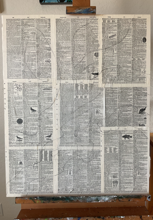 For this discussion, I’ll focus on the latest in my series of paintings inspired by high tide on a local beach - a 24x30 acrylic called Tidefoam, shown on the left. I began by taking photos of seafoam and kelp washed up by the tide. Back in my studio, I chose some pages from a 1930s dictionary, focusing on words related to sea life and water, and mounted them on a birch panel with matte medium. I then did a rough sketch, based on my references. After that, I layered several glazes in varying hues to build up the background, and then began the incredibly fiddly and time-consuming business of painting the final images in acrylic, using tiny brushes. I finished off the piece with a gloss coat.